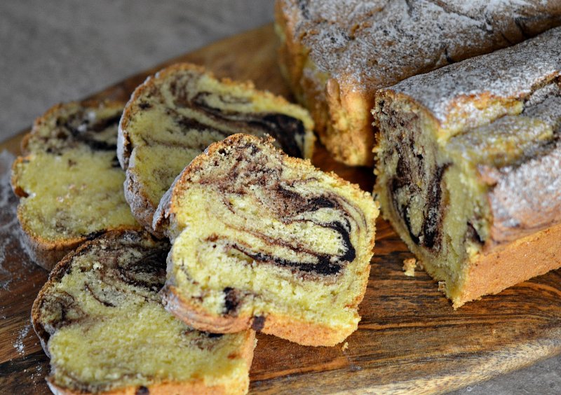 Impartim compozitia in tavi, lasand deoparte mai putin de un sfert, peste care punem cele doua linguri de cacao si 3-4 linguri de lapte. Amestecam bine, punem peste compozitia alba si, cu o scobitoare amestecam de sus in jos pentru a obtine efectul marmorat.
