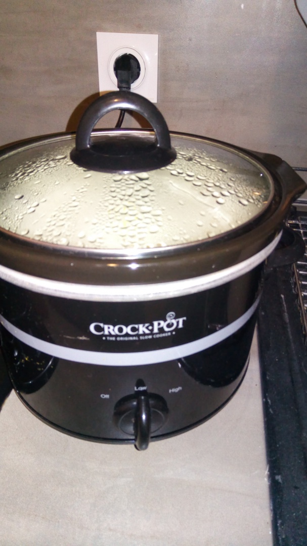 Punem toate ingredientele in vasul de la slow cooker Crock-Pot de 2.4l, amestecam putin cu un tel.