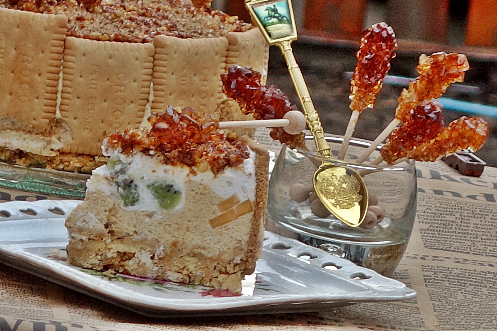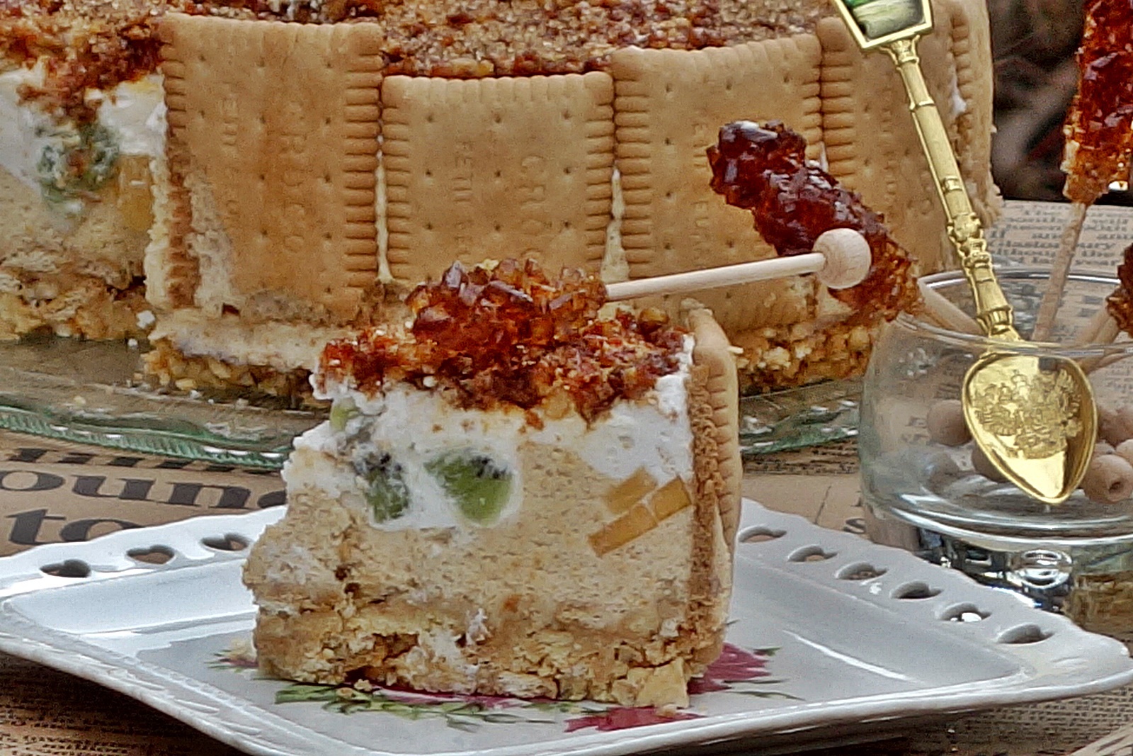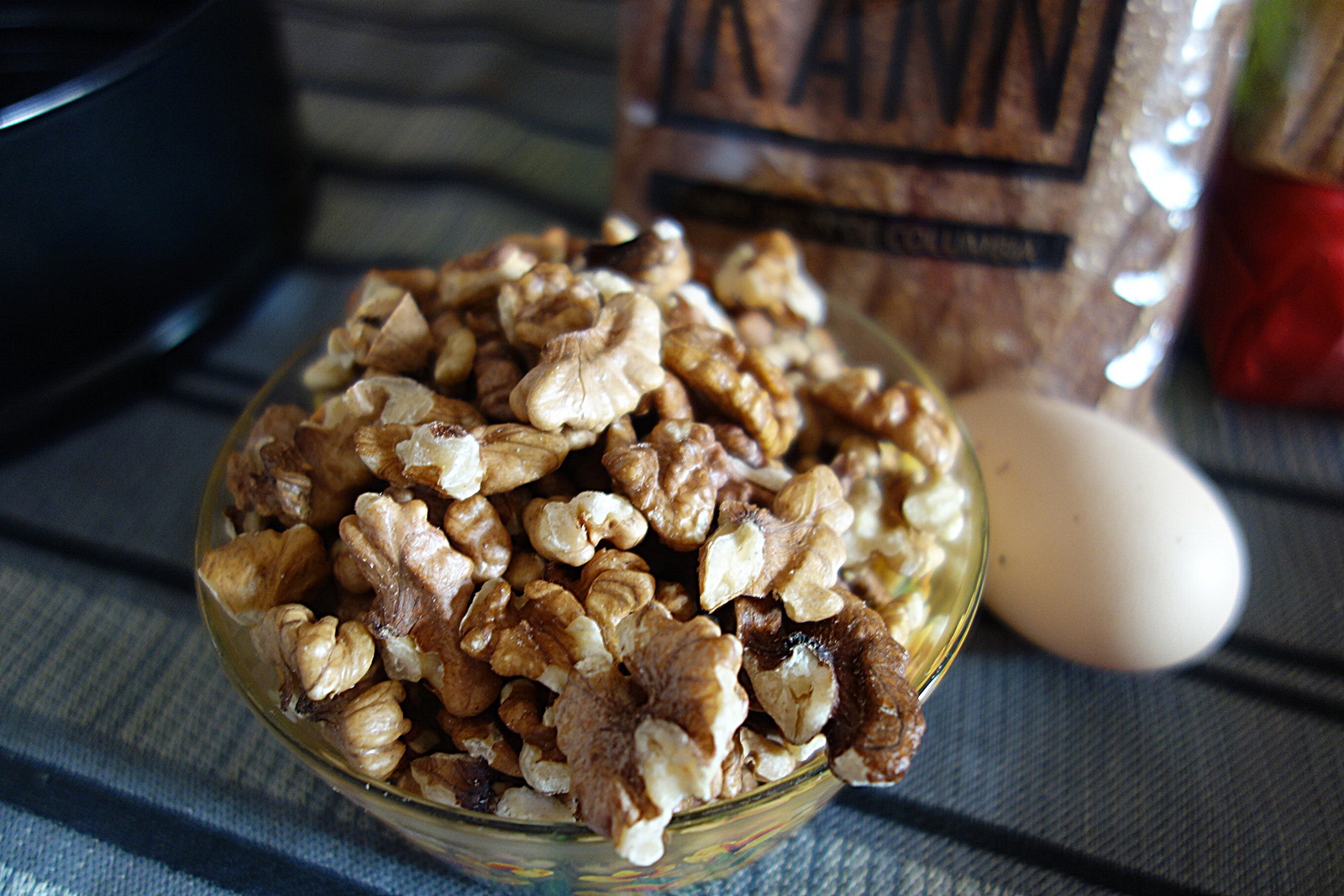 Biscuitii se maruntesc si apoi se amesteca cu miezul de nuca prajit si maruntit.