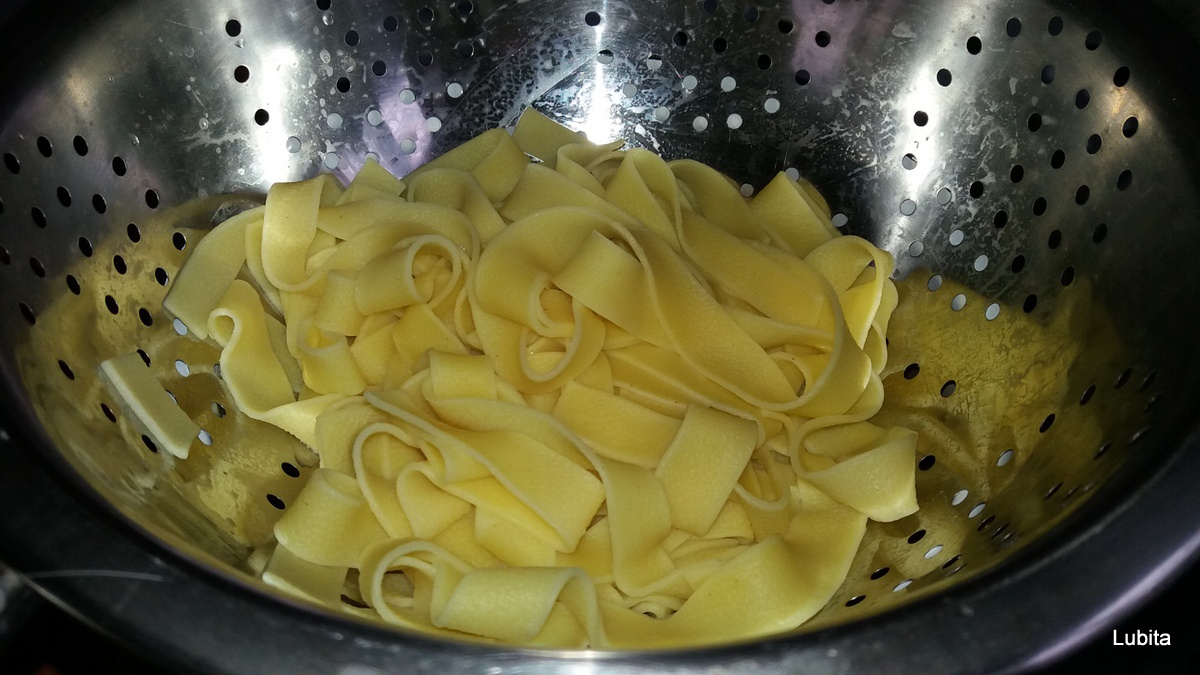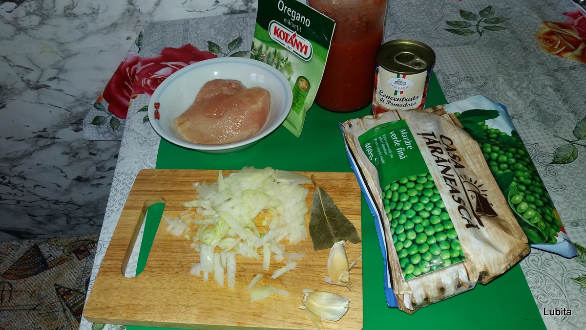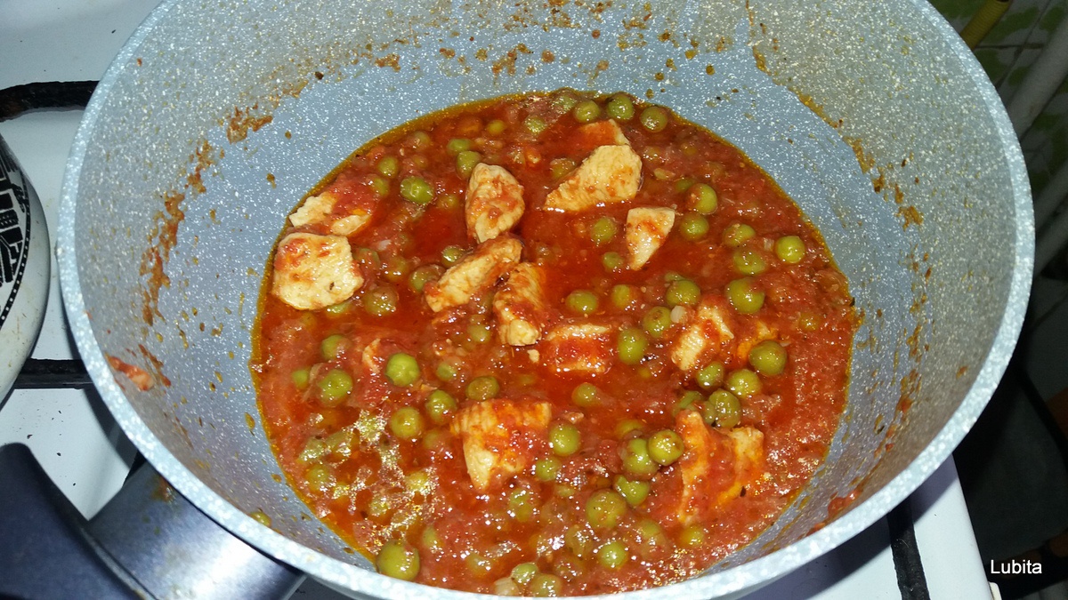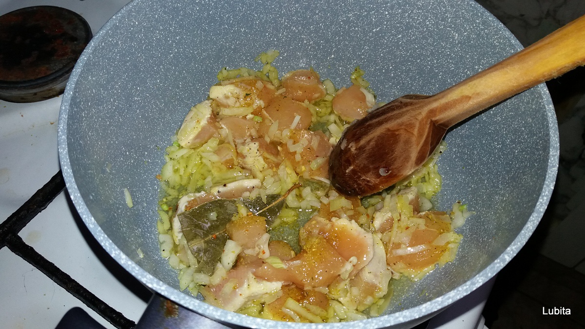 Pieptul dezosat, spalat, se taie cubulete si se soteaza in ulei cu putina apa.