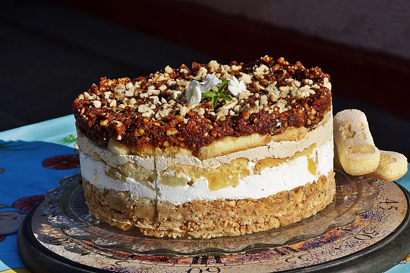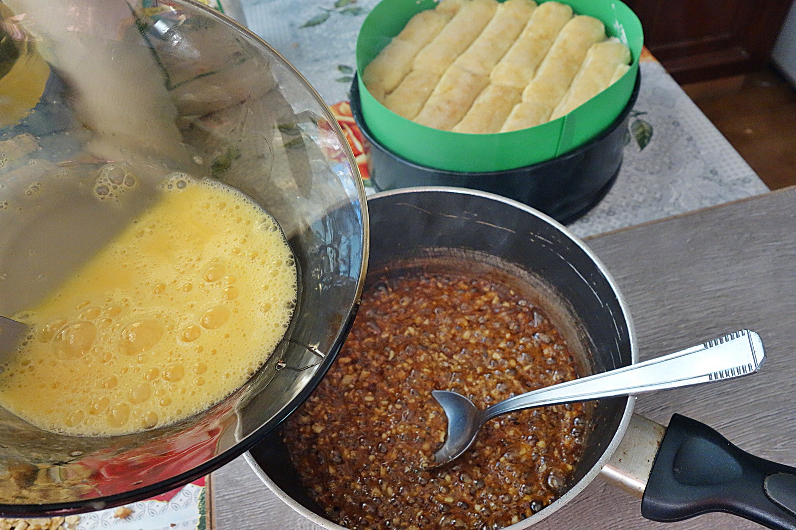 Se amesteca biscuitii maruntiti cu miezul de nuca prajit si maruntit.