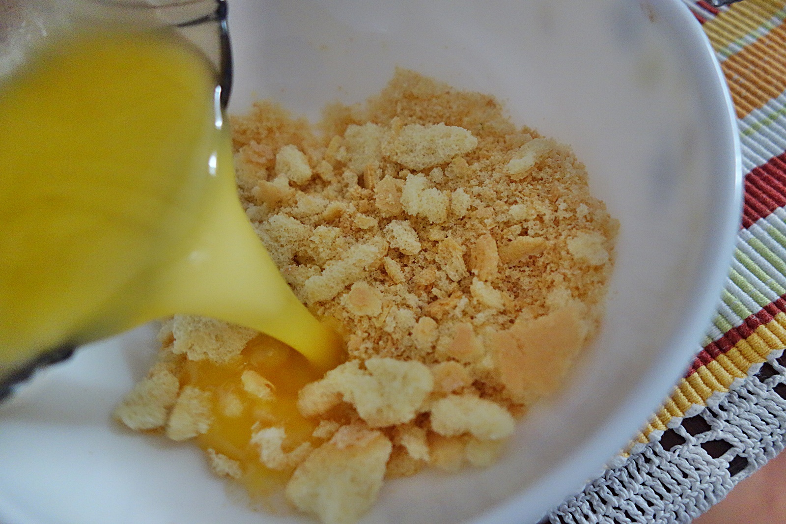 Se maruntesc piscoturile si se amesteca bine cu miezul de nuca maruntit si margarina topita.