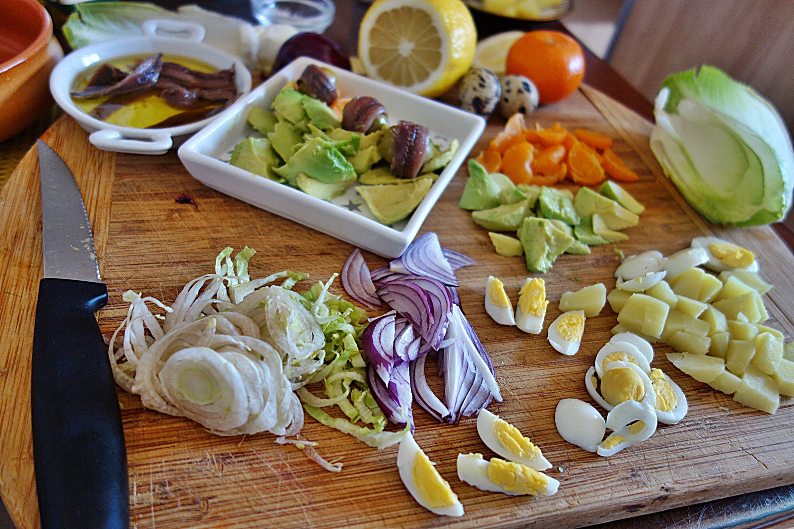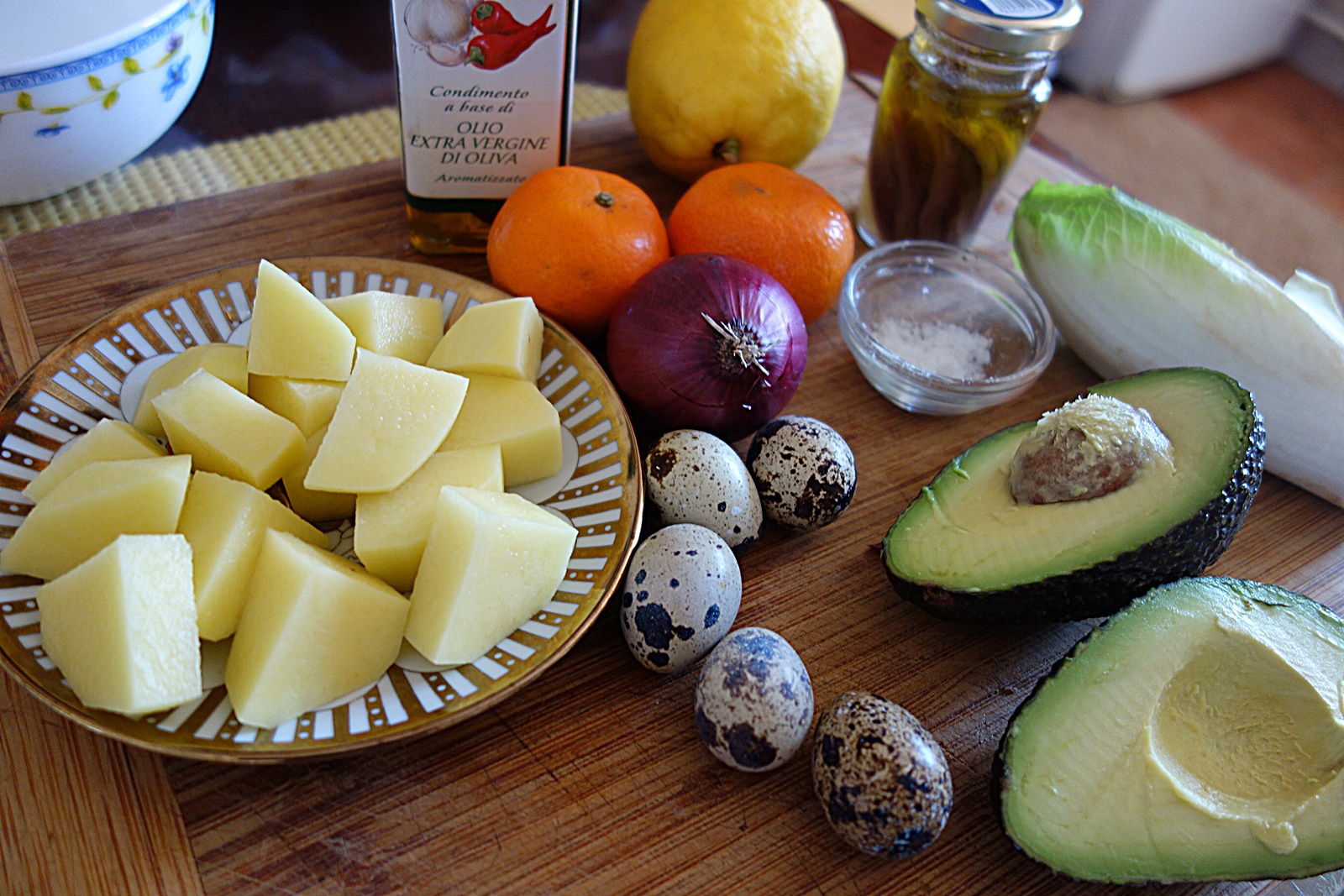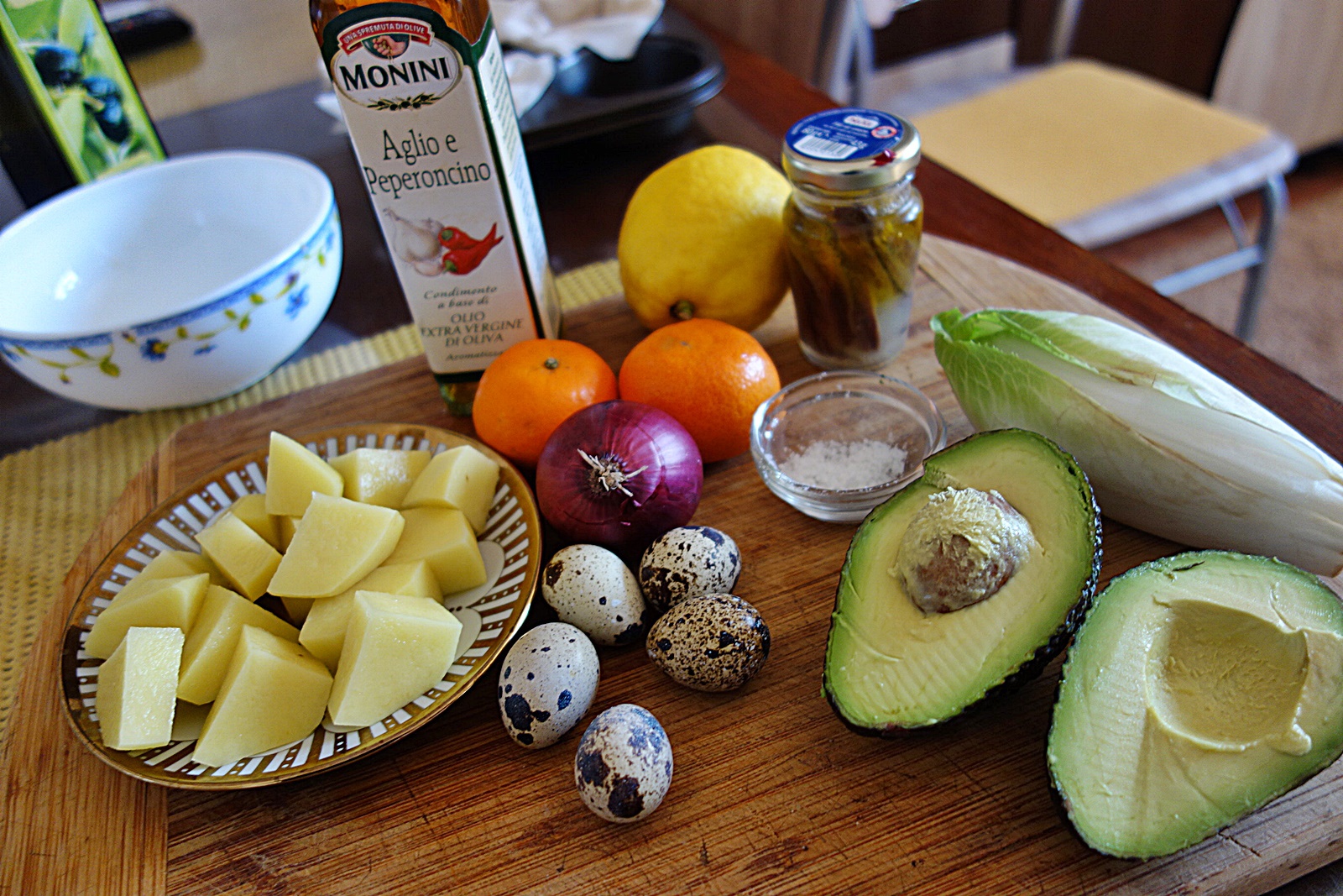 Se curata cartofii, se taie cubulete mici, se spala si se pun la fiert in apa cu sare.