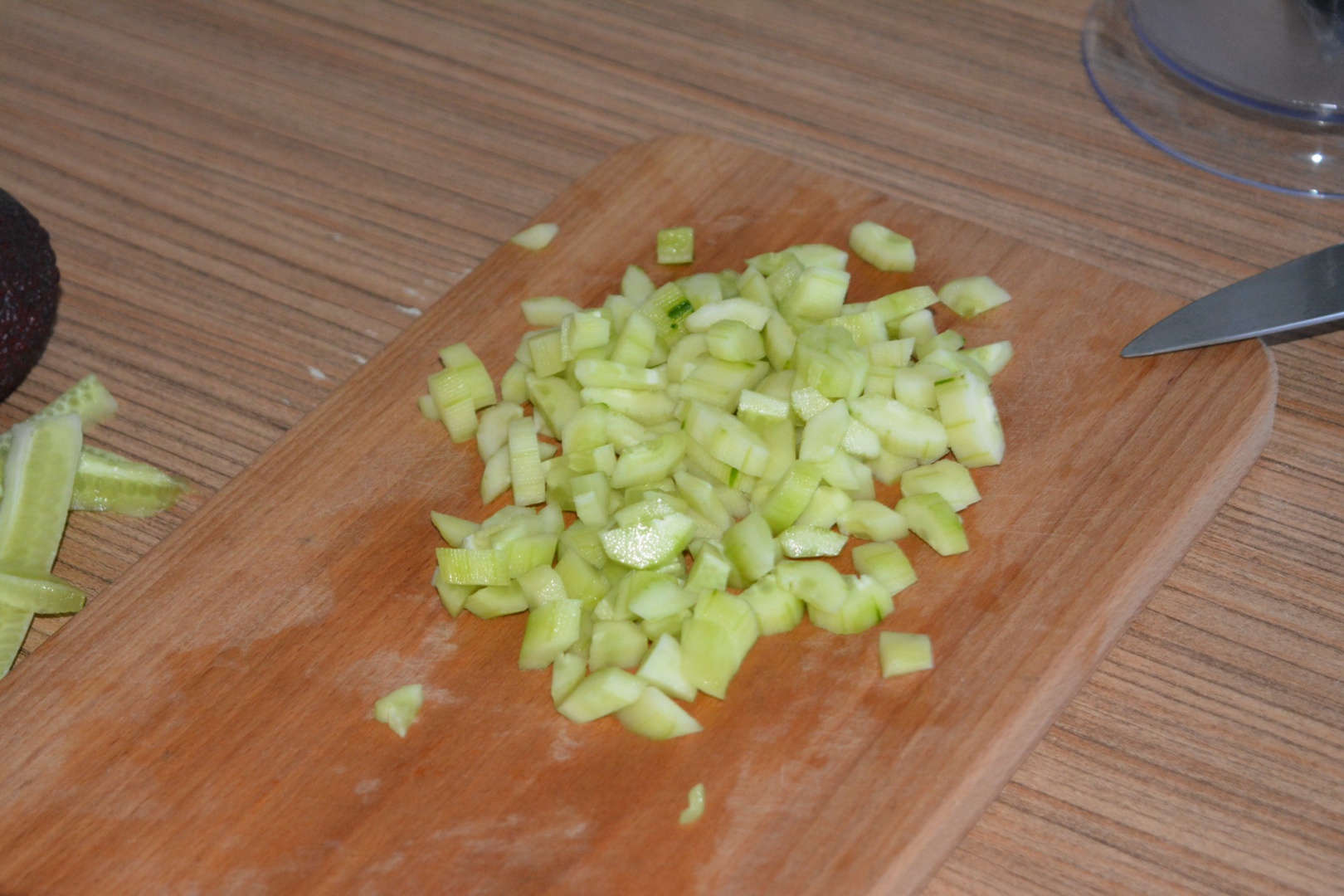 Se curata castravetii de coaja, se taie in sferturi, apoi se taie mijlocul cu seminte.
