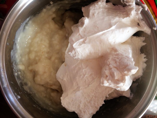 Blat-mixam albusurile spuma cu un praf de sare, adaugam zaharul si mixam pana ce devine o bezea lucioasa.