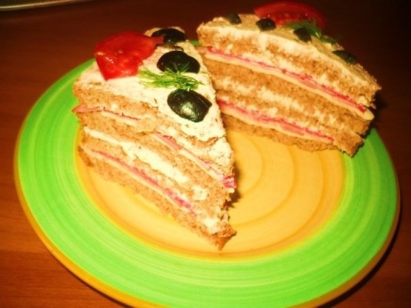 5. Tortuletul Delma:se fac 2 sandvizuri ca mai inainte, apoi se unge si partea deasupra si se suprapun, apoi s etaie in diagonala in forma de triunghi, se ung deasupra cu Creme Bonjour si se orneaza cu masline , felii de rosie si frunze de marar verde.