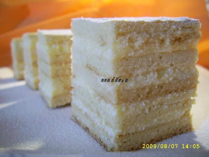 Cu aceasta crema se umplu foile si se da la rece pana a doua zi,cand se portioneaza si se pudreaza cu zahar.