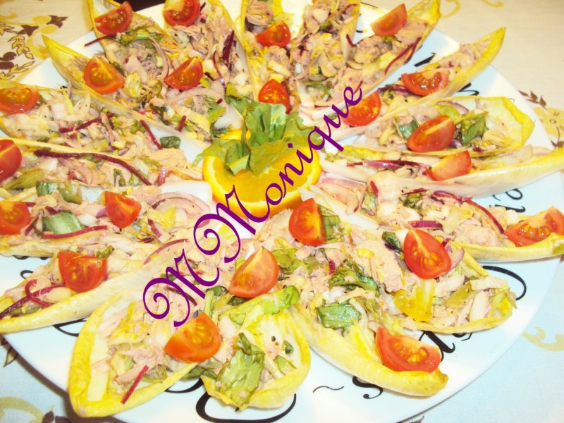Luaţi foile de andive păstrate în sucul de lămâie şi le umpleţi cu amestecul realizat. Aşezaţi andivele umplute pe un platou.