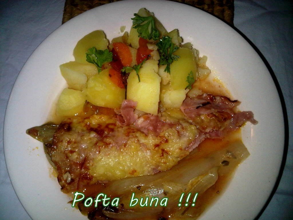 Cand lichidul a scazut la jumatate, punem sare si piper dupa gust, apoi deasupra andivelor adaugam si sunca presata taiata felii si cascavalul ras.