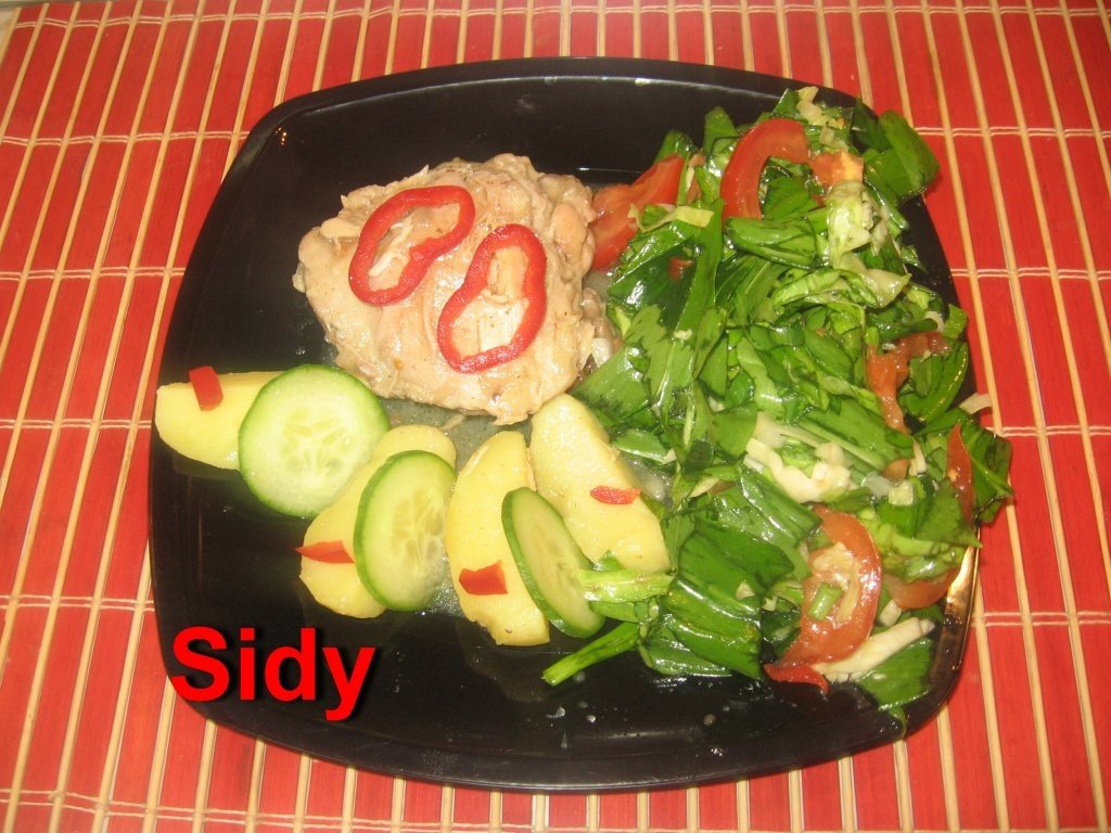 Servim pulpele cu cartofi natur presarati cu patrunjel verde deasupra si cu o salata de sezon.