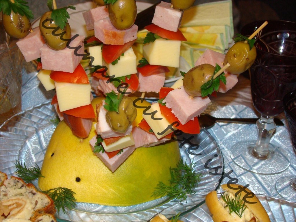 Se taie in patrate de 2,5 cm si se infing una dupa alta pe figaruie, iar la sfirsit se pune rosia cherry.(aici am pus masline) si fire de verdeata. Se fac astfel, cam 8 frigarui pentru fiecare jumatate de pomelo care se infing in fructul pus pe platou cu partea taiata in jos. Ochii, se fac din boabe de piper,iar mustatile din fire de marar .Pofta buna !