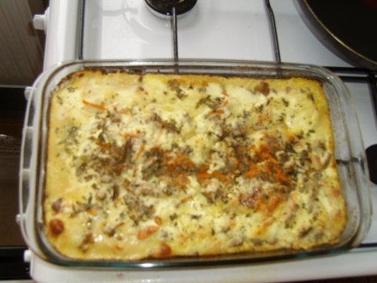 In alt castronel se amesteca oul si smantana ramase si cascavalul dat pe razatoare (sau tocat cubulete). Acest amestec se toarna uniform peste compozitia din tava.