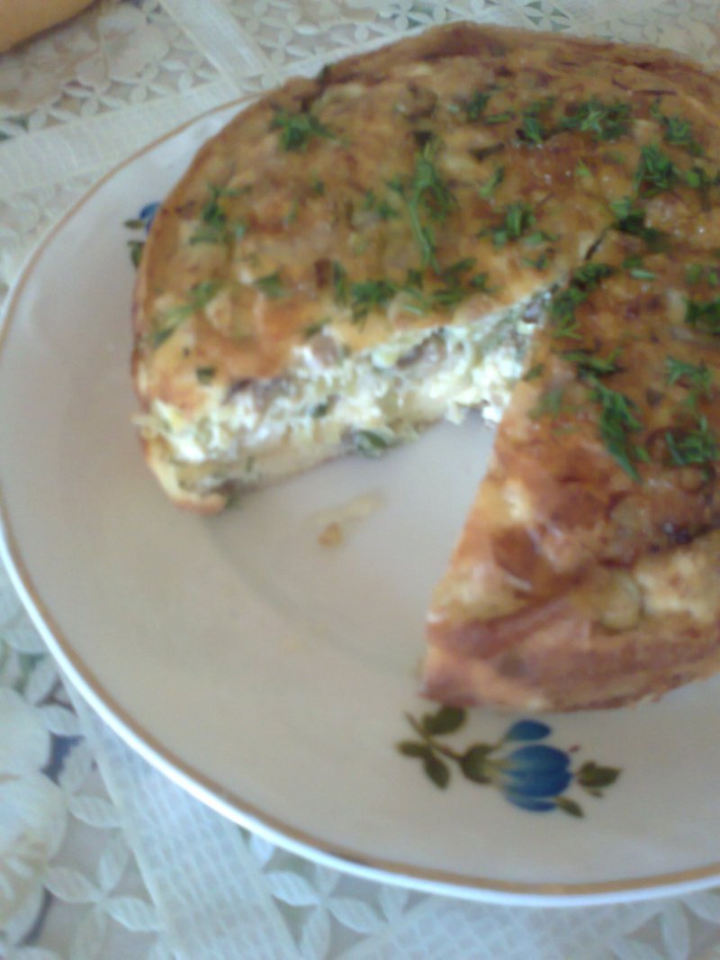 Tocăm ceapa verde mărunt şi o adăugăm peste compoziţia de mai suse. Ciupercile le punem într-o strecurătoare la scurs, brânza şi usturoiul le dăm pe răzătoarea mică, mărarul îl tocăm mărunt şi le adăugăm pe toate în castron. Punem 8 ouă din cele 10, delicat după gust şi amestecăm totul foarte bine.