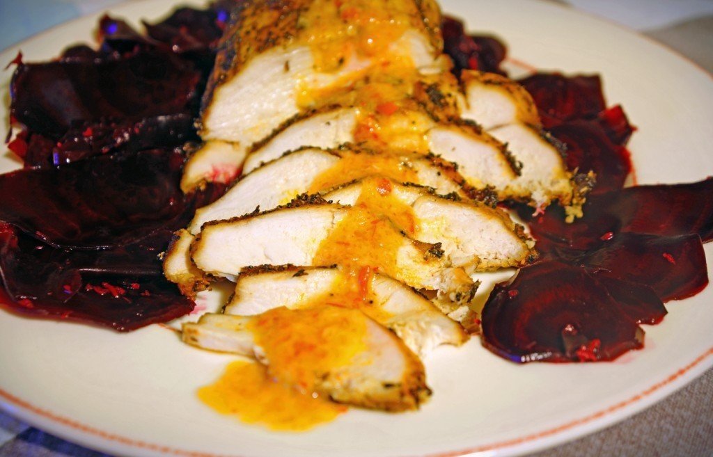 3.Feliaţi pieptul de curcan. Se aranjează frumos pe platou, înconjurat de sfeclă, se stropeşte cu un sos la alegere (poate fi sos tartar, sau un sos picant –noi am folosit o cremă de usturoi copt şi chili) şi se poate servi cald sau rece. Un vin bun pentru a acompania această reţetă este Pinot Noir, sau un Chardonnay dacă preferaţi alb.