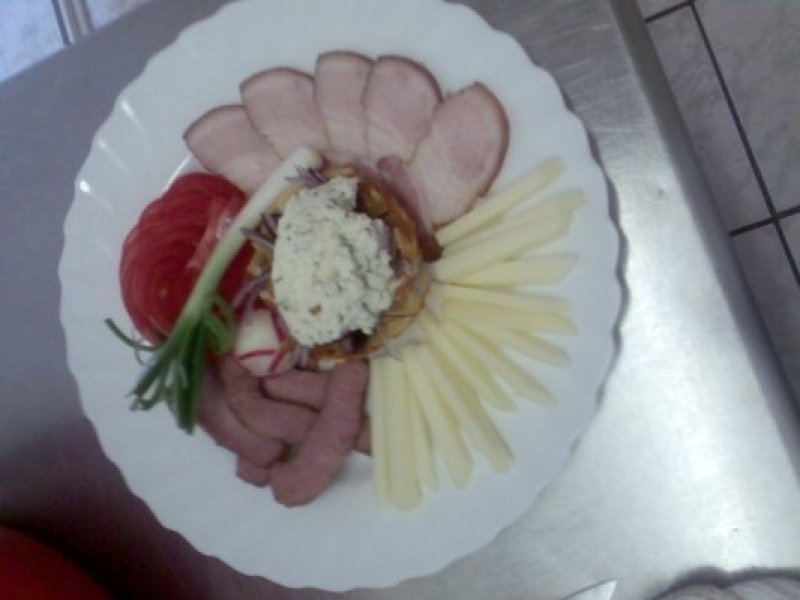 Se taie sunculita si pastrama la aproximativ 0,5 cm grosime,iar cascavalul ,pe lung,fidelute.Se taie o rosie jouliene,ceapa verde,dintr-o ridiche se modeleaza o floricica.Totul se aseaza pe o farfurie,in mijloc intrun cosulet de cartofi ,adaugandu-se crema de branza cu marar.