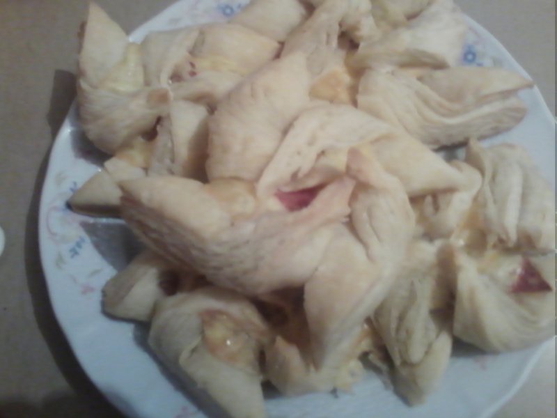 Se taie aluatul in patratele si apoi colturile patratului ca in poza. Se pune in mijloc o feliuta de salam peste care se aseaza un patratel de cascaval. Se ia cate un colt si se duce catre mijloc, la fel se procedeaza si cu celelalte 3. Se aseaza in tava si apoi se introduc in cuptorul incins. Se lasa pana se coc uniform.