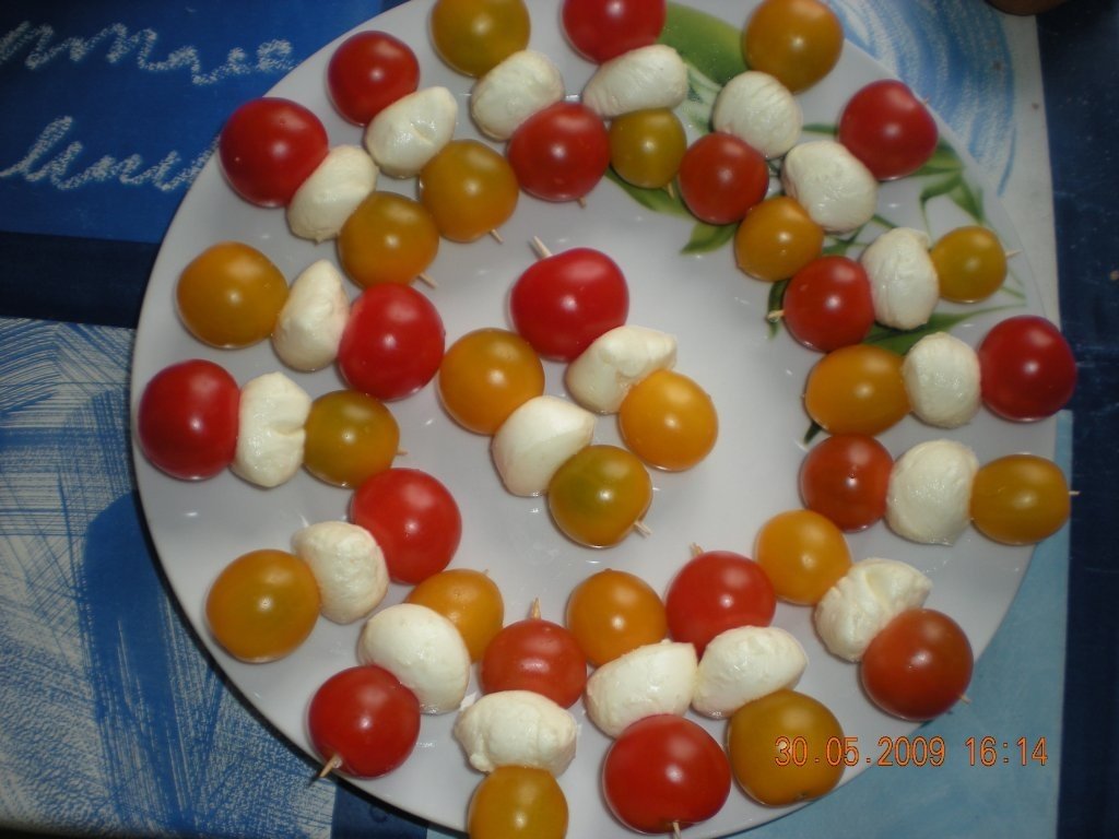 Se spala rosiile si se usuca. Mozzarrella se scurge de zeama. Se pregatesc cateva scobitori pentru a baga pe rand o rosie, o mozzarrella si din nou o rosie. Se asaza pe un platou sau pe o farfurie, se sareaza, se toarna ulei de masline si un pic de oregano. Se servesc ca aperitiv rece.