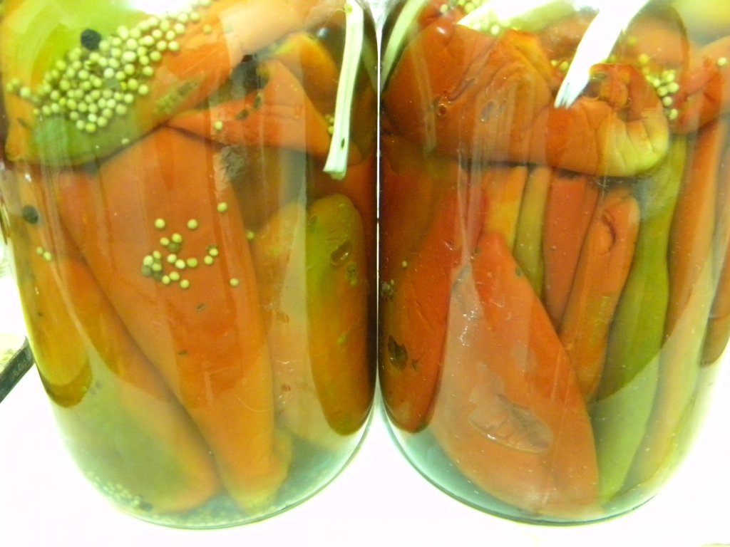 Cand lichidul clocoteste, se pun ardeii capia sa intre bine in lichid, si se lasa sa fiarba 2-3 clocote. Dupa aceea se scot cu spumiera si se pun intr-o cratita, continuindu-se la fel, pina cind se termina toata cantitatea de ardei.