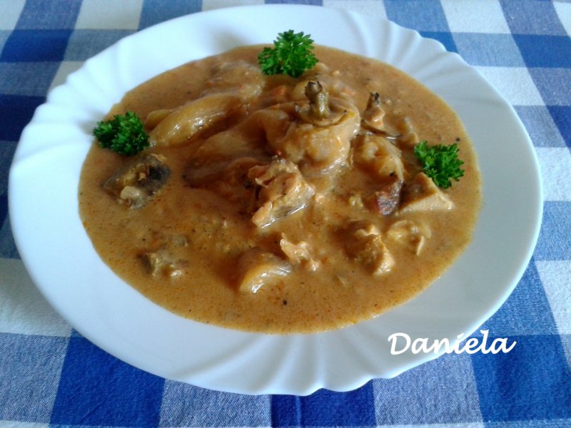 2 cepe potrivite, le-am taiat marunt si le-am calit usor in 2 linguri de ulei.Pieptul de pui l-am taiat cubulete si l-am pus peste ceapa, am amestecat pana ce si-a schimbat culoarea, am adaugat o lingurita de boia de ardei afumata, un varf de cutit de piper si zeama pe care au lasat-o ardeii dupa ce i-am curatat de coaja. A dat un clocot, am pus ardeii copti si vreo 5 catei de usturoi taiati marunt si a mai dat un clocot .Separat, 2 linguri de smantana de 12 % am amestecat cu 100 ml de apa rece si o lingura de faina alba, am trecut totul prin sita si am pus peste mancare. Am amestecat usor pana ce zeama s-a ingrosat si am dat deoparte. A iesit o bunatate de mancare,minunata si cu gust de vara !Pentru dieta, se inlocuieste smantana cu lapte , faina cu amidon si gata, este dietetica !