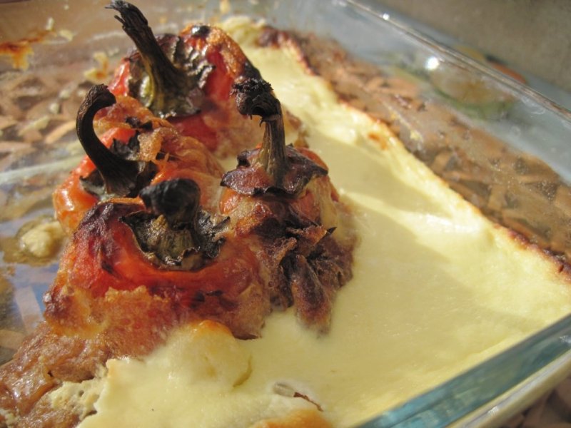 Se perpara un sos din smantana cu un ou, cateii de usturoi curatati si feliati si sare dupa gust. Sosul se toarna peste ardeii pane care, in prealabil, sunt aranjati intr-o tavita mai inalta, astfel incat coditele lor sa ramana in afara (vezi poza).
