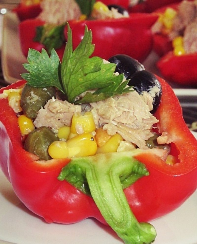 Separat, in alt bol, amestecam tonul scurs de ulei, maslinele, porumbul, caperele si alunele.