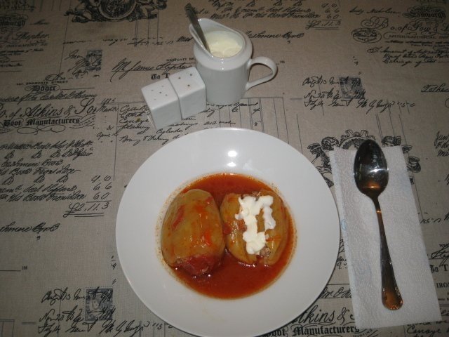 Ardeii se curata de seminte,se spala si se umplu cu compozitia de carne tocata.Din 2-3 rosii taiate felii atasam un "capac" la fiecare ardei.