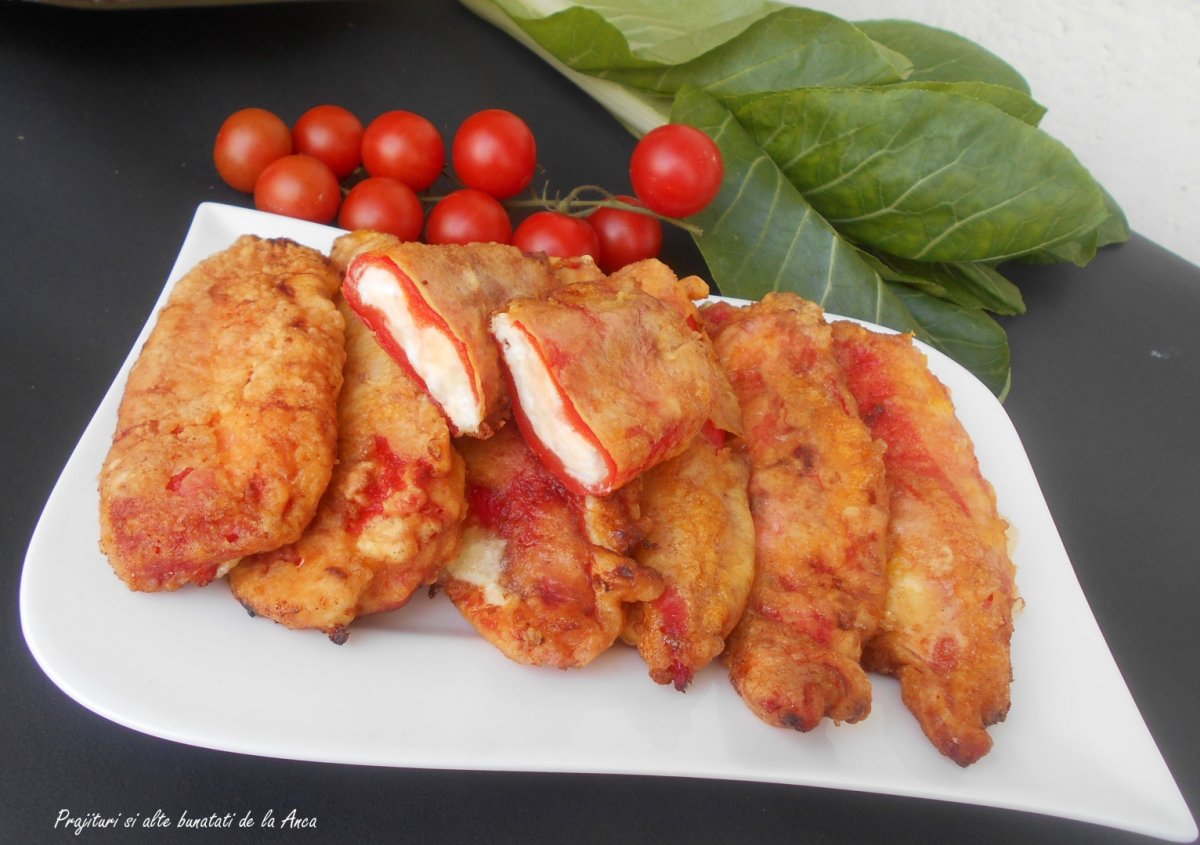 Ardeii ii curatam de coaja si de seminte si ii desfacem ca si pe o carte . Vom avea din fiecare ardei cate o felie. Punem cate o lingura de branza pe fiecare si refacem ardeiul unind partile laterale.