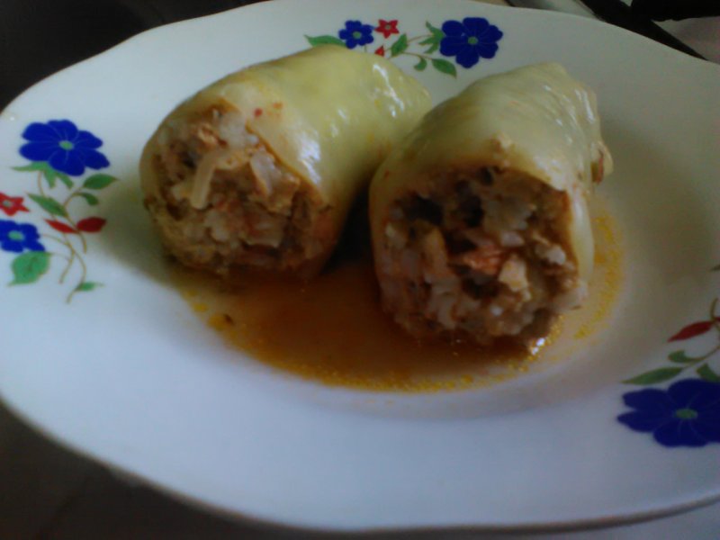 Pentru umplutura, se caleste in putin ulei, ceapa taiata marunt, adaugam orezul si condimentele (sare, piper, cimbru si marar, pasta de ardei), iar la urma, carnea tocata si cele doua oua. Se amesteca bine, apoi se umplu ardeii cu acesta compozitie; se pun intr-o oala mai inalta si se pune 1 cana cu apa. Se pun pe foc pana dau intr-un clocot si apoi se pune bulionul si putin cimbru. Se fierb la foc mic, cam 45-50 minute. Se pot servi cu smantana.