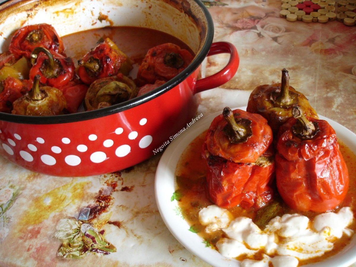 Mod de preparare: Se curata, se spala ceapa (se opreste una pentru sos), se toaca marunt sau se da prin masina de tocat carne iar apoi se caleste in putin ulei si se pune la scurs in strecuratoare.Verdeata spalata si scursa se da prin masina sau se toaca marunt . Orezul se opareste sau se fierbe pe jumatate. Carnea toccata se amesteca cu oul, verdeata, ceapa calita si scursa, orezul oparit, condimentelel, si ½ cana de apa calduta (apa face carnea sa nu ramana tare la fierbere) Se bate bine compozitia. Se spala ardeii si se scurg bine. Li se taie frumos un capac cu tot cu codita care se va pune deasupra. Se curata de seminte si se umplu cu aceasta compozitie lasand loc de 1 deget . Li se pune la fiecare un capacel de rosie si apoi se calesc un pic ardeii pe toate partile. Se scot ardeii si se caleste in uleiul ramas ceapa toccata, morcovul curatat si dar prin razatoarea mica.(cine doreste poate aduga si ½ lgt faina pentru un sos mai gros).Se stinge cu apa fierbinte si bulion . Se aseaza frumos ardeii in picioare, li se aseaza capacele lor cu codita, se dau rosiile prin razatoarea mica si se pun printre ardei. Se fierbe apa si se adauga peste ardei sa ii acopere. Se pun condimente, foi de dafin, piper si se fierb ½ ora acoperiti. Se da apoi cratita la cuptor sa scada la jumatate. Daca este nevoie se mai adauga bulion. Se servesc fierbinti cu smantana.