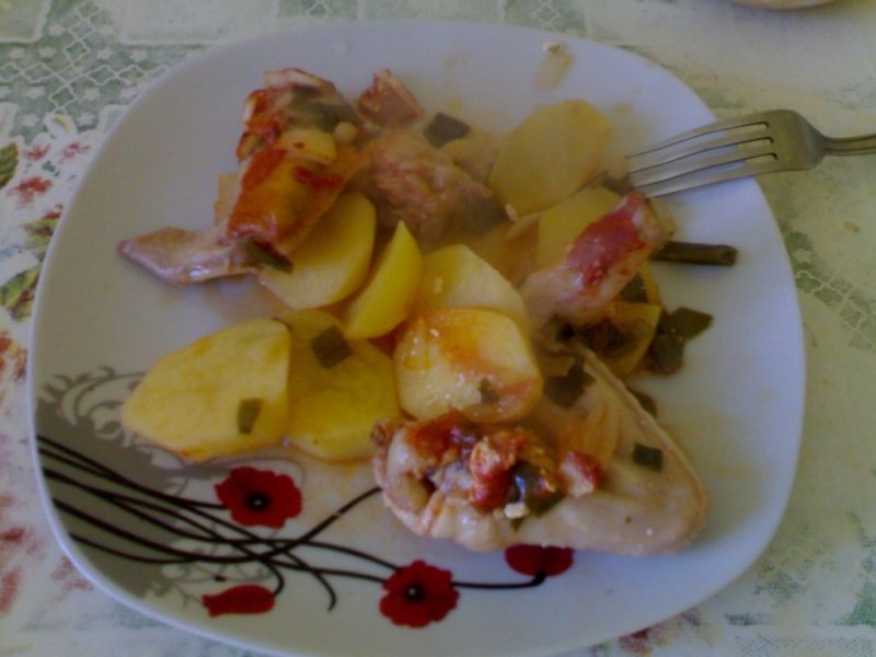 Se spala carnea, se usuca si se asaza intr-o tava (se pune prima pentru ca fierbe mai greu). Peste ea se pune ceapa, ardeiul si cartofii taiati rondele.