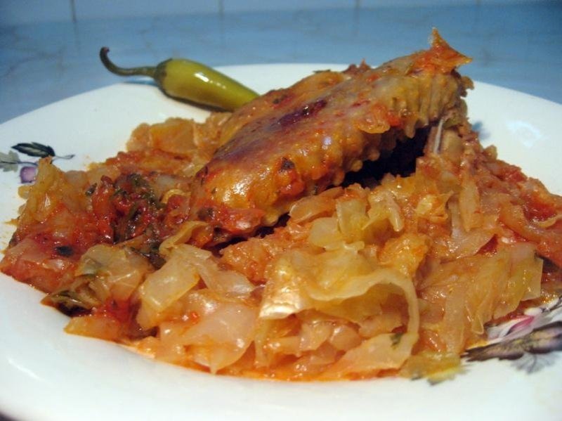 Când varza este fiartă şi carnea de raţă de asemenea... le-am pus într-un vas de lut, în care, de obicei fierb sarmalele. Deci am pus în vasul de lut un strat mare de varză fiartă (cam 3/4 din toată varza), nişte roşii cherry, puţin pătrunjel proaspăt tocat, apoi carnea şi apoi restul de varză, iarăşi nişte roşii cherry frunzele de dafin şi puţin pătrunjel tocat. Am combinat puţină zeamă de carne cu zeamă de varză şi am adăugat bulionul, boabele de piper, delikatul şi apoi l-am turnat în vas.