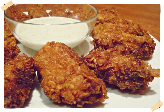 Într-un bol batem două ouă, adăugăm o lingură de lapte, sare şi puţină boia de ardei iute. Amestecăm totul cu o furculiţă sau un tel. Întindem o folie de plastic şi aşezăm fulgii de porumb pe jumătate din suprafaţa ei. Cu cealaltă jumătate de folie acoperim fulgii, iar apoi îi fărâmiţăm pe deasupra foliei cu ajutorul unui făcăleţ.