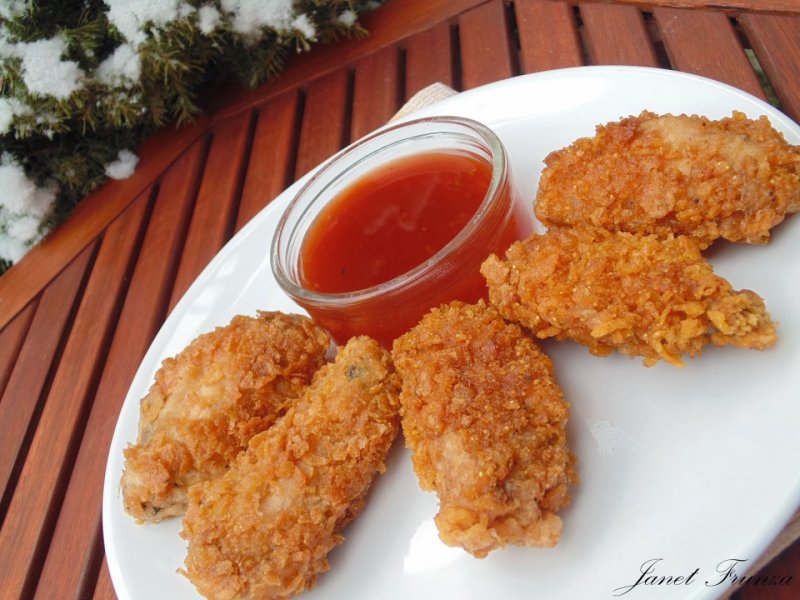 Luam fiecare bucata de aripa, o trecem prin faina, apoi prin ou batut si apoi prin fulgii de porumb. Dupa ce am terminat operatiunea cu toate aripile, le vom praji in ulei incins, la foc mai mic, pentru a se patrunde bine carnea. Le scoatem pe servetele absorbante de bucatarie si le vom servi alaturi de sosul picant, pe care l-am pregatit astfel:
