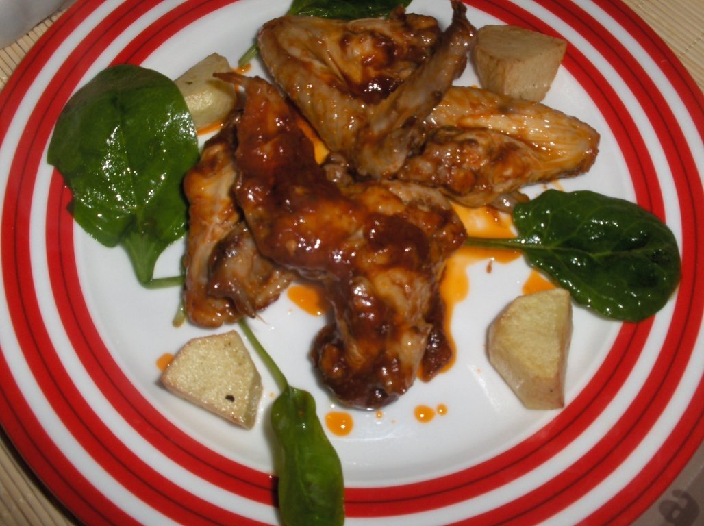 1) Se pun la prãjit aripioarele condimentate cu sare, piper, usturoiul zdrobit, sos picant dupã plac, foarte putin ulei pt. cã aripile vor lãsa grãsime, ketchup cât sã acopere aripile, la fel vin, cât sã acopere.