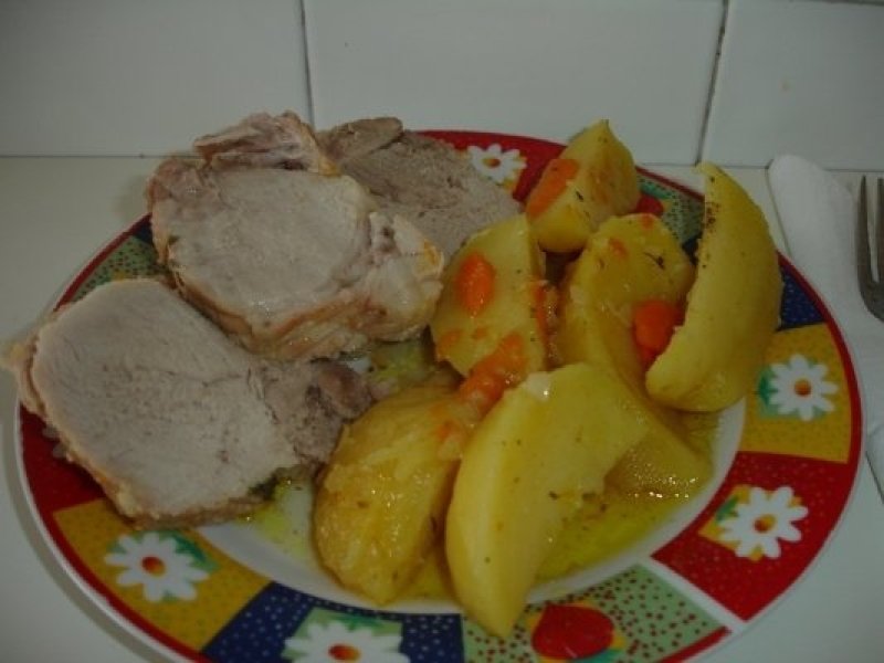Se serveste carnea alaturi de cartofi si cu o lingura din sucul rezultat la coacerea cotletului.