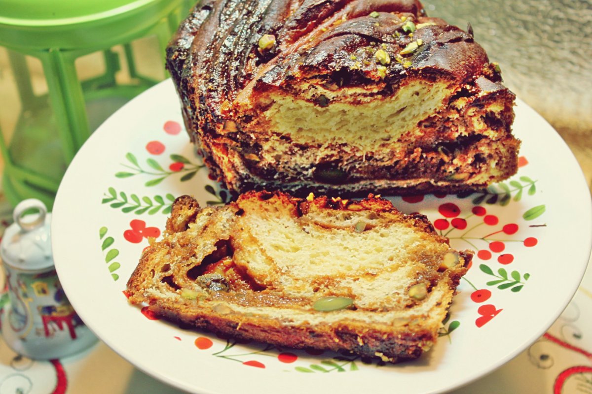 A doua zi aluatul se întinde pe masa de lucru ușor înfăinată, se unge cu dulceața de lapte, lăsând margini de cca. 2 cm, apoi se presară fisticul mărunțit și sarea. Marginile rămase ibere se ung cu puțină apă, apoi se rulează aluatul pe partea mai scurtă, înspre noi. Ruloul obținut se taie cu un cuțit bine ascuțit, pe lungime, pe din două, apoi se împletește aluatul. Forma de cozonac se unge cu ulei, apoi se pune Babka obținută și se lasă la dospit încă 2 ore, la temperatura camerei sau chiar mai mult dacă mai aveți timp și răbdare.