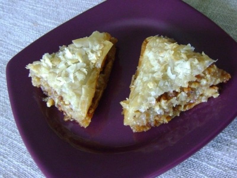 Se unge o tava cu unt si se asaza in tava 3-4 foi de placinta stropite intre ele cu unt topit.Se presara jumatate din cantitatea de umplutura si se pun alte 3-4 foi stropite intre ele cu unt.Se presara si restul de umplutura si deaspura se pun 4 foi frumoase stropite intre ele cu unt.Una sau 2 foi se rup in bucatele foarte mici si se presara desupra baclavalei.Se portioneaza baclavaua cu un cutit foarte ascutit,taindu-se dreptunghiuri sau patrate.Se stropeste cu unt,mai ales de-a lungul taieturilor si pe margini.Se da la cuptor la foc mic pana se aureste frumos.Cand este gata,se toarna siropul peste baclava si se da din nou tava la cuptor sa fiarba cateva minute cu siropul.Pofta buna!!!