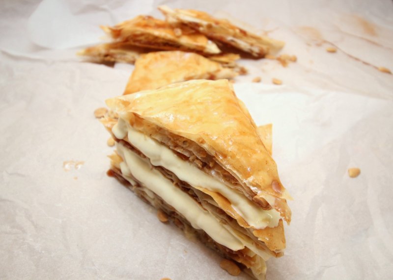 Topim untul. Cu un cutit am tocat putin nucile si alunele. Cu o pensula ungem pe rand cate o foaie cu unt iar apoi presaram nucile si alunele. Procedam astfel cu fiecare foaie pana avem un strat de 8 foi. Se taie patratul foii in triunghiuri.