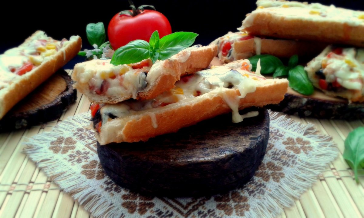 Se unge o tava cu ulei si se tapeteaza cu hartie de copt. Baghetele se umezec cu apa pe partea crocanta, se aseaza in tava, apoi se umplu astfel: se pune salamul prajit, ciupercile si ardeiul, boabe de porumb (se pastreaza cateva pentru a mai pune si la final), compozitia din ou si ketchup, cascavalul ras si alte cateva boabe de porumb.