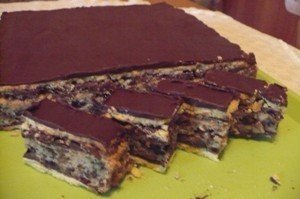 se bat cele 7 galbenusuri spuma tare cu 200 gr. zahar , se adauga 150 gr. nuci taiate , 200gr. rahat taiat , 180 gr. ciocolata taiata bucati mici , 50 gr. stafide , 150 gr. faina . se coace in tava unsa cu margarina rama si tapetata cu hartie.