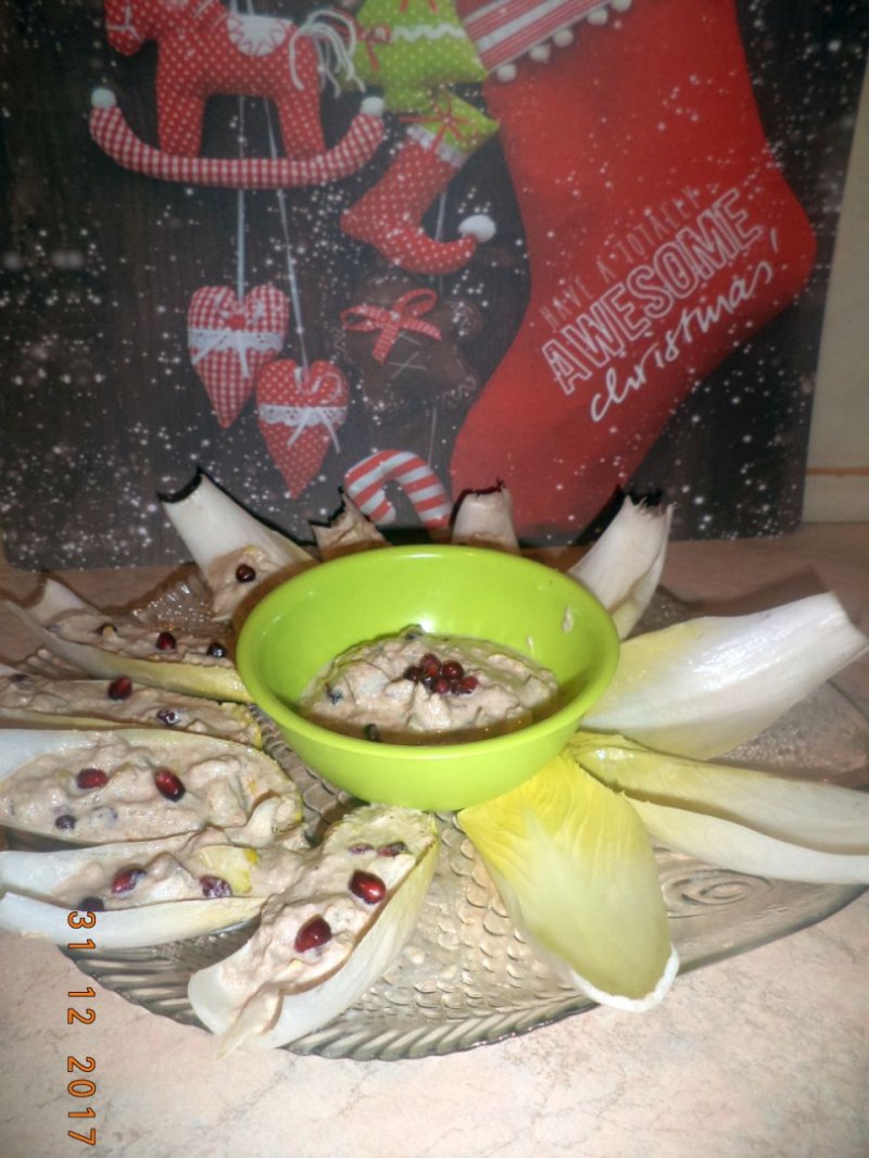 Spalam andivele, curațăm primele frunze si scobim cotorul apoi punem andivele în apă pentru circa 10 minute. Curățăm rodia și punem semințele la scurs, tocam cubulețe ananasul și de asemenea îl punem la scurs. Desfacem andivele și oprim frunzele mai frumoase, iar restul le tocăm. Amestecam tonul cu andivele, adăugăm smântâna și omogenizăm compoziția, apoi adăugăm ananasul și semințele de rodie. Potrivim gustul de sare și piper și mai lăsăm compoziția să se scurgă circa 10-15 minute, după care o dăm la frigider. Înainte de servire umplem frunzele de andive cu salată.