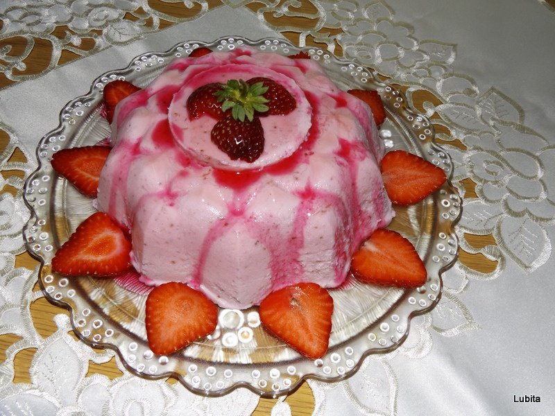Dupa omogenizare, se rastoarna intr-o forma pe care o are fiecare,si se lasa la frigider pana a doua zi,cand se rastoarna pe un platou si se orneaza cu sirop si capsune taiate.