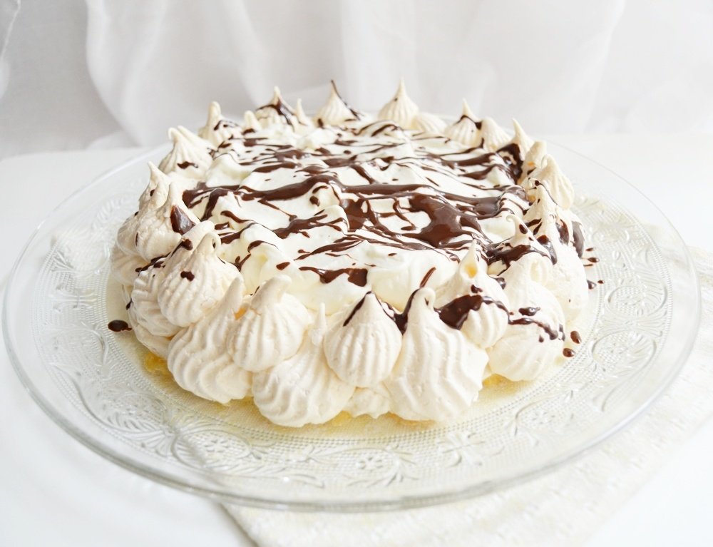 6. Pune compozitia intr-un pos si urmeaza conturul cercului, iar apoi umple-l. Mai pune un rand de bezea pe marginea cercului si introdu tava in cuptor (seteaza cuptorul pe ventilatie, daca ai un cuptor pe gaz coace bezeaua cu usa intre-deschisa) pentru 1h-1 h 30 min. Dupa ce s-a copt o lasi sa se raceasca.
