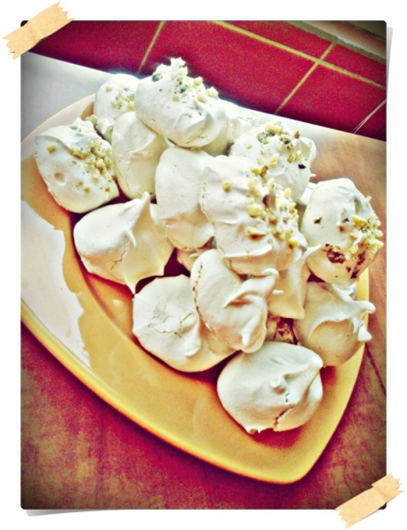 Aşezaţi hârtie de copt într-o tavă.. şi aşezaţi spuma cu lingura sau cu un şpriţ special la distanţă cam de 4-5 centimetri între ele ca să nu se lipească pe parcurs. Spuma trebuie să rămană în forma în care o aşezaţi, altfel e prea moale şi se va lăsa ulterior…dar la gust ies oricum bune, eu am dat greş de multe ori la faza asta până să-mi iasă cum trebuie. Deasupra, presăraţi nucă pisată sau alune, migdale..ce vă trece prin cap. Le las în cuptor la 130 de grade în jur de 35 de minute..dar asta depinde de fiecare aragaz în parte aşa că nu vă luaţi după mine neapărat (am un cuptor cu o flacără a naibii de puternică). Trebuie să le verificaţi din 10 în 10 minute, fără să ţineţi uşa deschisă prea mult. Când se dezlipesc de pe hârtie uşor şi sunt puţin arămii şi crocante la suprafaţă, e semn că sunt gata. Nu le lăsaţi prea mult pentru că nu vor mai avea consistenţa aceea lipicioasă înăuntru. Totuşi, dacă vă plac mai crocante le puteţi ţine mai mult în cuptor.