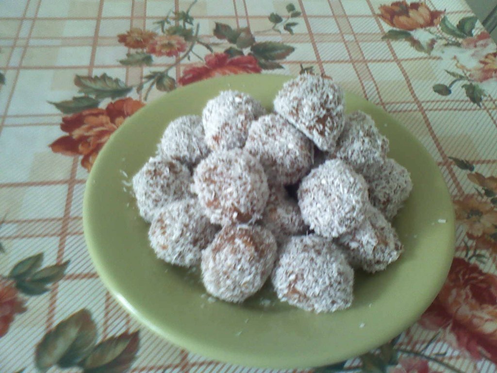Pe o farfurie se pune nuca de cocos,din compozitia obtinuta in vas se fac bilute si se dau prin nuca de cocos.