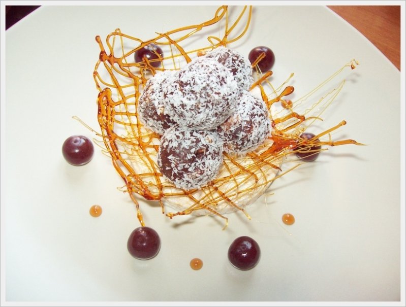 Luam din compozitie facem biluta, punem visina si inchidem bila. Se dau prin nuca de cocos.