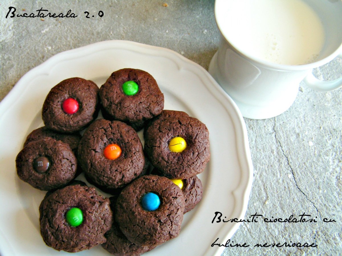 Biscuitii se aseaza in tava pe hartie de copt si se coc in cuptorul preincalzit la 170°C timp de 15 minute, apoi se lasa sa se raceasca in tava aproximativ 10 minute, dupa care se transfera pe un gratar si se lasa sa stea minimum 30 minute. Se pastreaza cateva zile intr-o cutie metalica. Daca rezista :) Caci sunt deliciosi cu lapte!