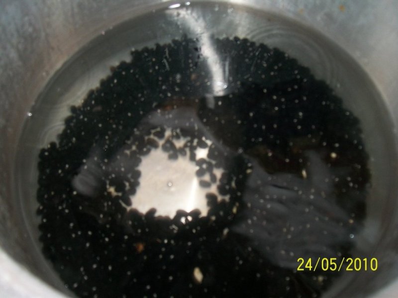 Se lasa pe foc aproximativ 50-60 de minute, dupa care se ia capacul si se incearca fasolea, daca este aproape gata se curata 2-3 banane verzi mici(guineo)si se pun intregi in supa, se iau si se spala 2-3 oua se dezinfecteaza bine si se pun la fiert in black soup cu tot cu coaja(uimirea mare a fost foarte mare, dar acesta este obiceiul), continuandu-se fierberea inca 15 minute.