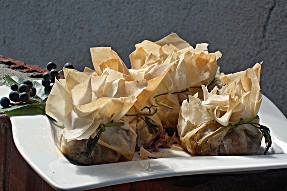 Foile de placinta, asezate una peste alta, se taie in patru parti egale, obtinand astfel 24 de bucati egale. Se suprapun cate doua, astfel incat colturile sa formeze o stea, apoi se pun in forme unse cu un pic de ulei si se pune cate o lingura de umplutura, deasupra se asaza o felie subtire de cascaval, apoi se prind usor cu codite de patrunjel sau foi de ceapa verde, legandu-se ca niste boccelute. Se pot lasa si nelegate. Se dau la cuptor, cca. 15-20 de minute, pana ce foaia de placinta se rumeneste usor. Se servesc reci sau calde.
