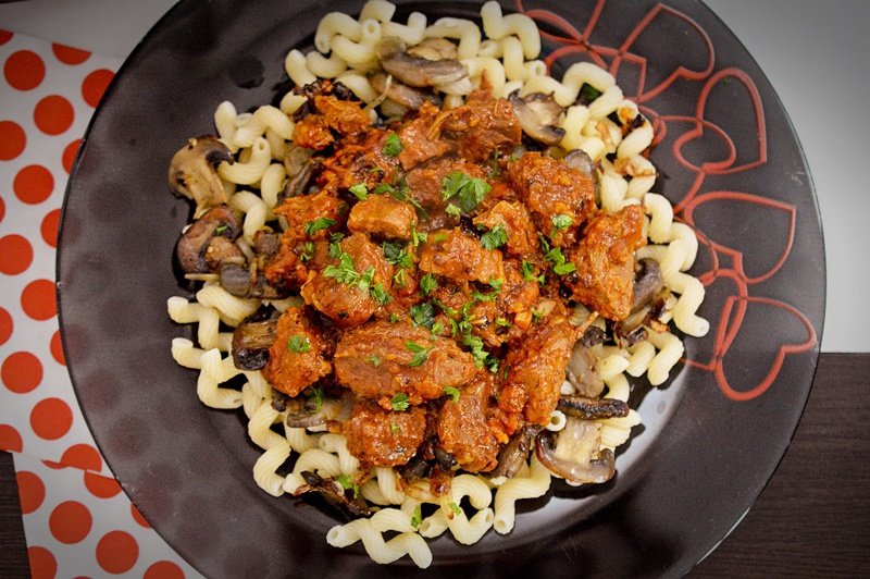 Cat timp se gateste carnea pregatim ciupercile sotate. Ciupercile taiate felii le-am calit usor intr-o tigaie cu putin ulei. Cand s-au rumenit usor, am pus peste ele ceapa taiata solzisori, sare si piper. Am mai sotat cateva minute si am dat deoparte.